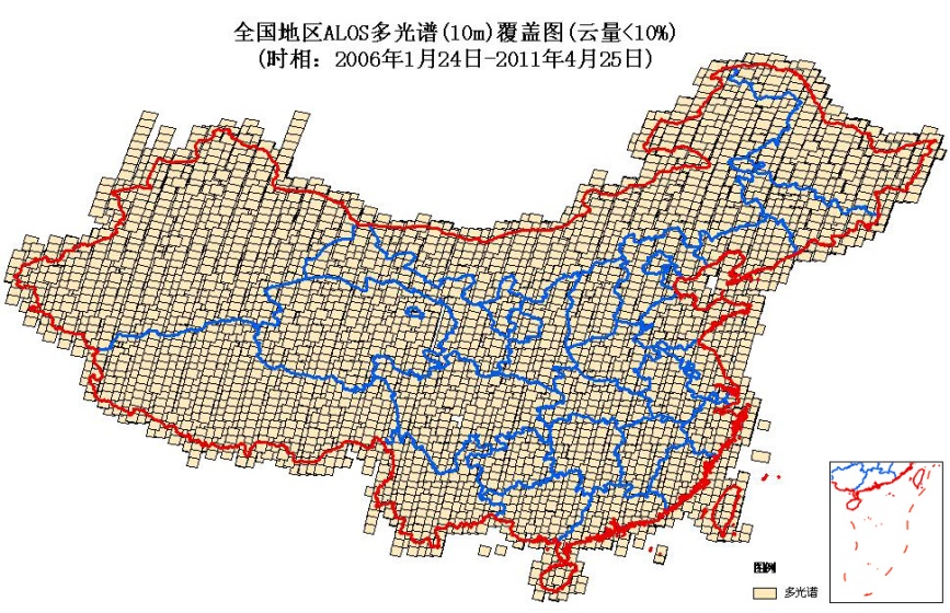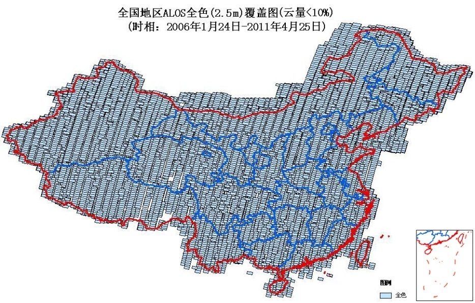 ALOS卫星自2006年1月24日发射升空到2011年4月22日停止运行以来,由3个传感器拍摄了覆盖全球的约6.5亿景存档数据。其中在中国的覆盖率﹥95%,多光谱数据更可实现100%覆盖,仅2010年一年全国覆盖率(10%云量)为2.5米全色92.86%,10米多光谱93.44%。